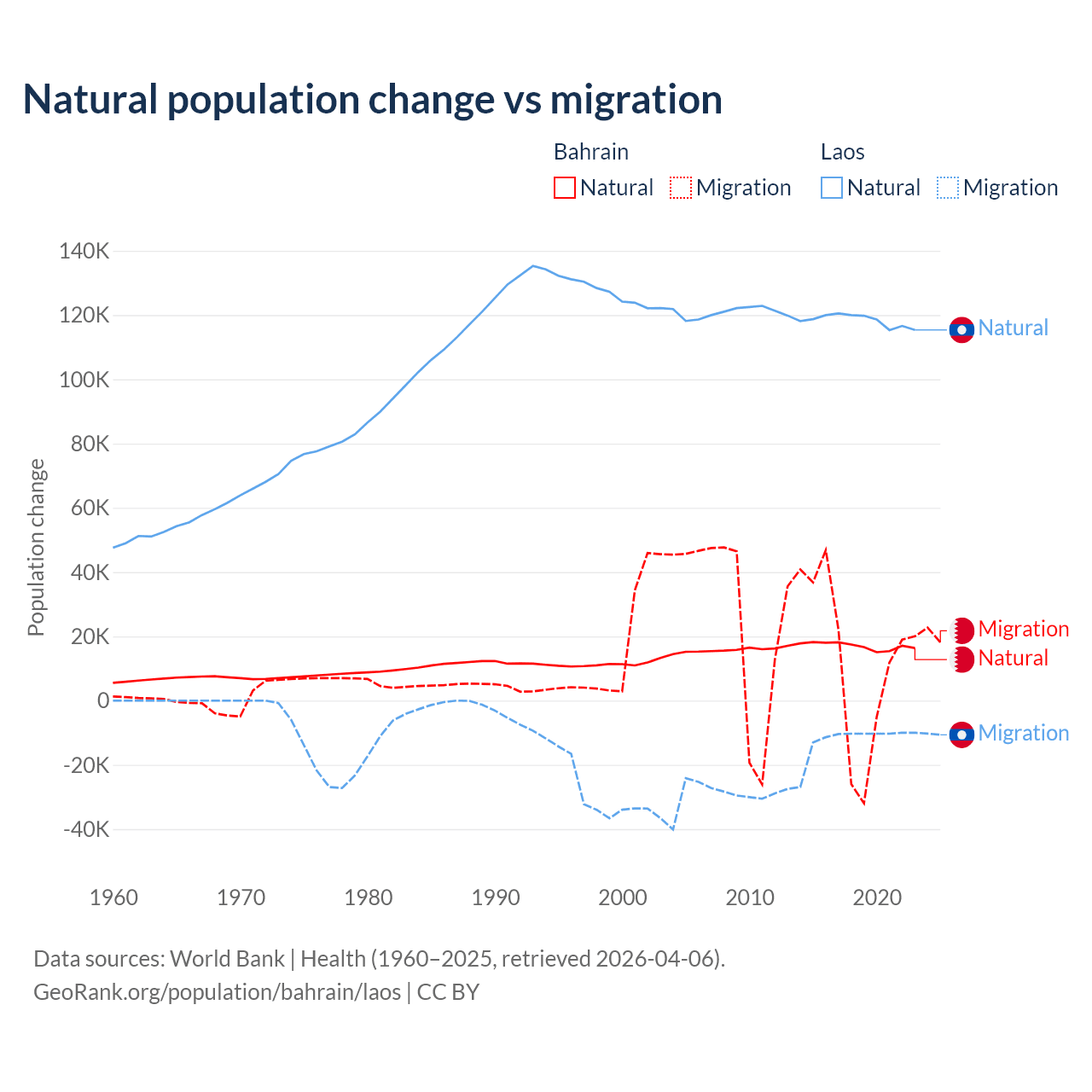 Over the last 10 years, 55.9% of the population change in Bahrain is from natural causes (a gain of 170,110 people) and 44.1% is from migration (a gain of 134,281 people). In Laos 90.6% is from natural causes (a gain of 1,183,013 people) and 9.41% is from migration (a loss of 122,899 people).