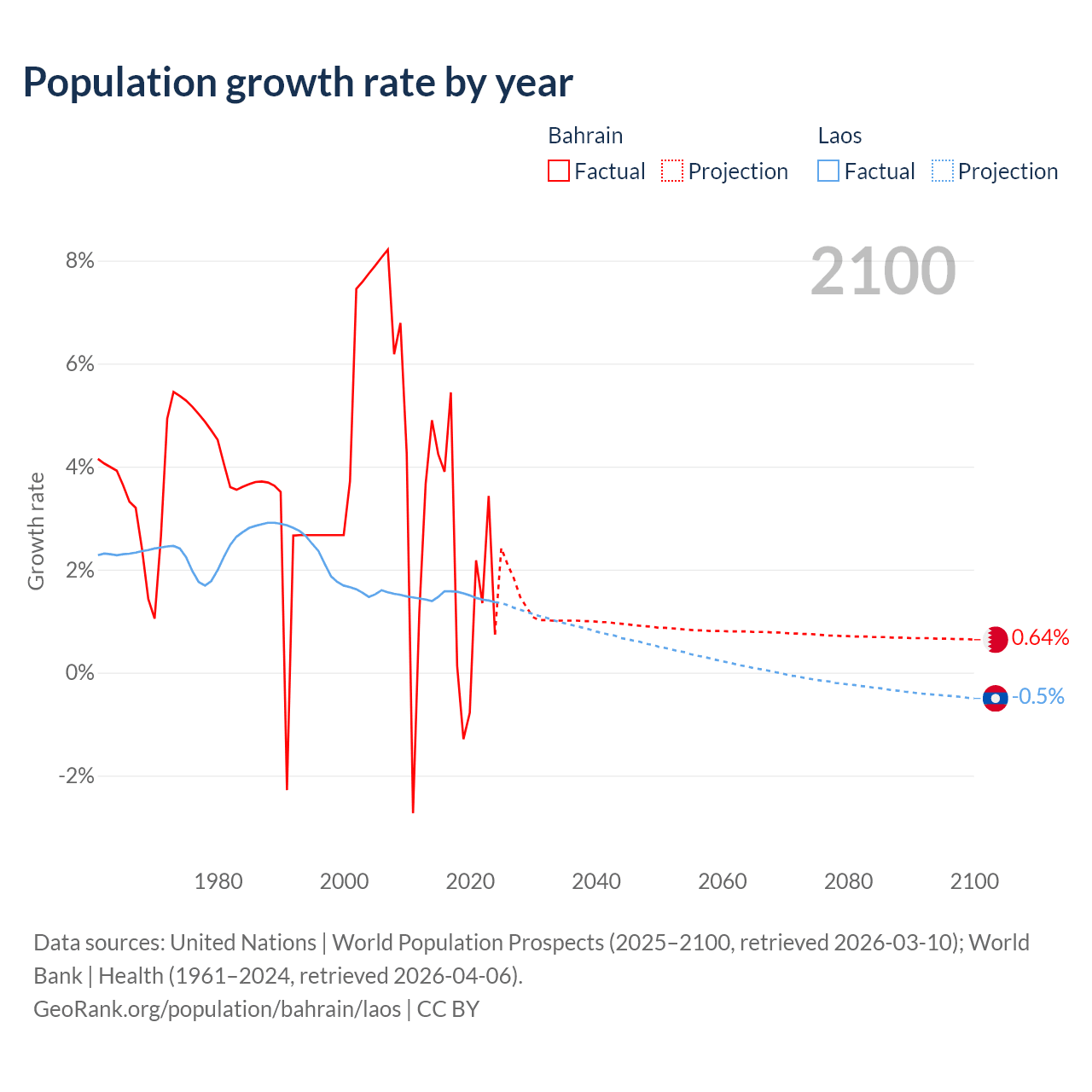 - For the last 10 years, Bahrain has had an average growth rate of +2.2% per year vs +1.48% in Laos.