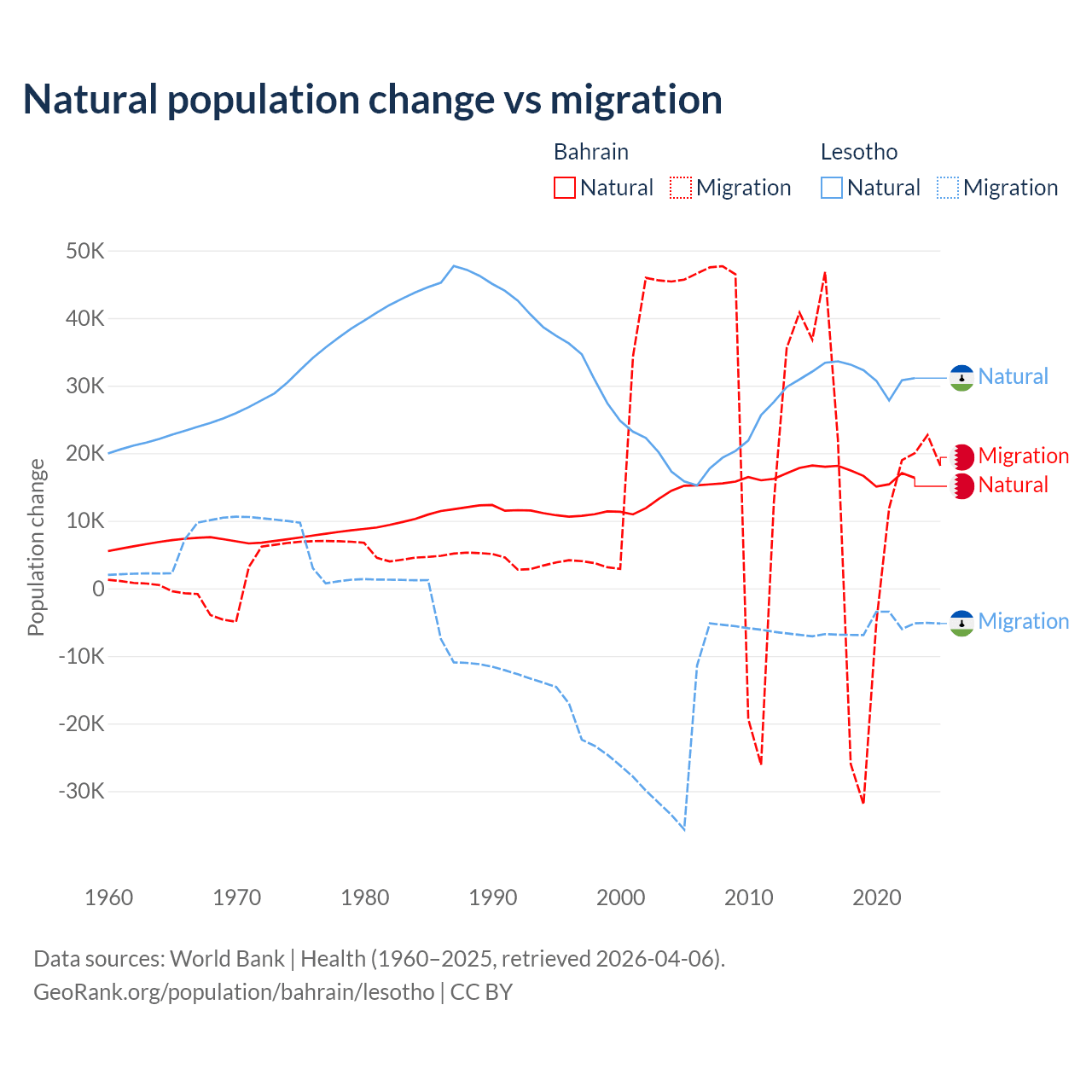 Over the last 10 years, 55.9% of the population change in Bahrain is from natural causes (a gain of 170,110 people) and 44.1% is from migration (a gain of 134,281 people). In Lesotho 84.2% is from natural causes (a gain of 315,836 people) and 15.8% is from migration (a loss of 59,457 people).