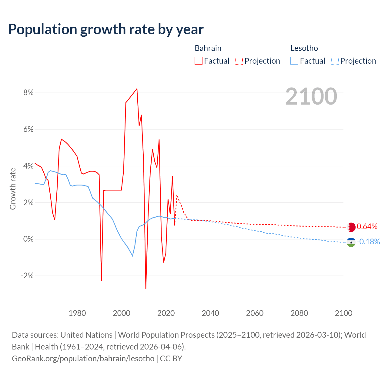 - For the last 10 years, Bahrain has had an average growth rate of +2.2% per year vs +1.17% in Lesotho.