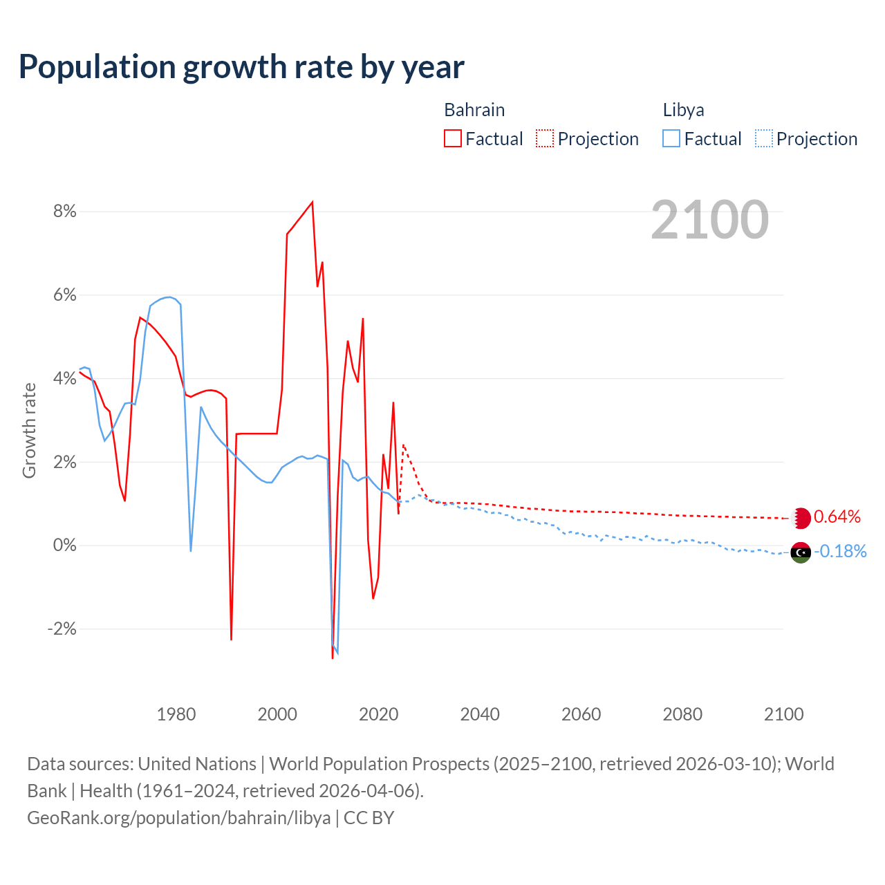 - For the last 10 years, Bahrain has had an average growth rate of +2.2% per year vs +1.44% in Libya.