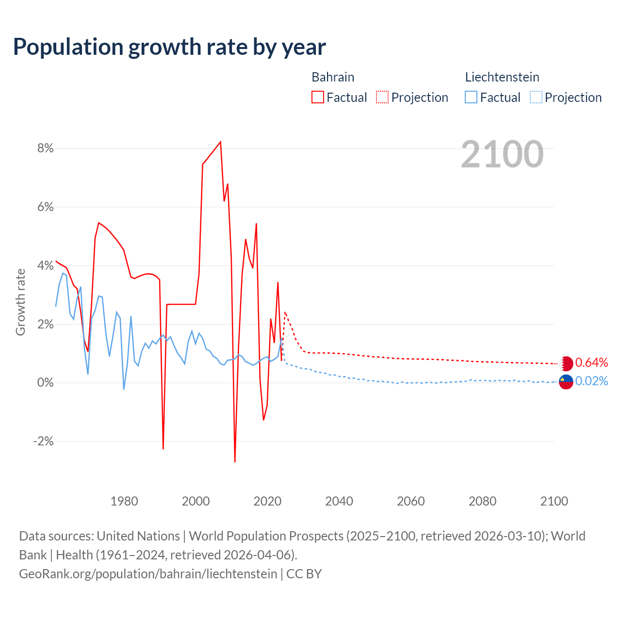 - Since 2006, the population of Bahrain has increased from 960K people to 1.67M (73.8% growth), while Liechtenstein has grown from 35K to 41K (17.1% growth).