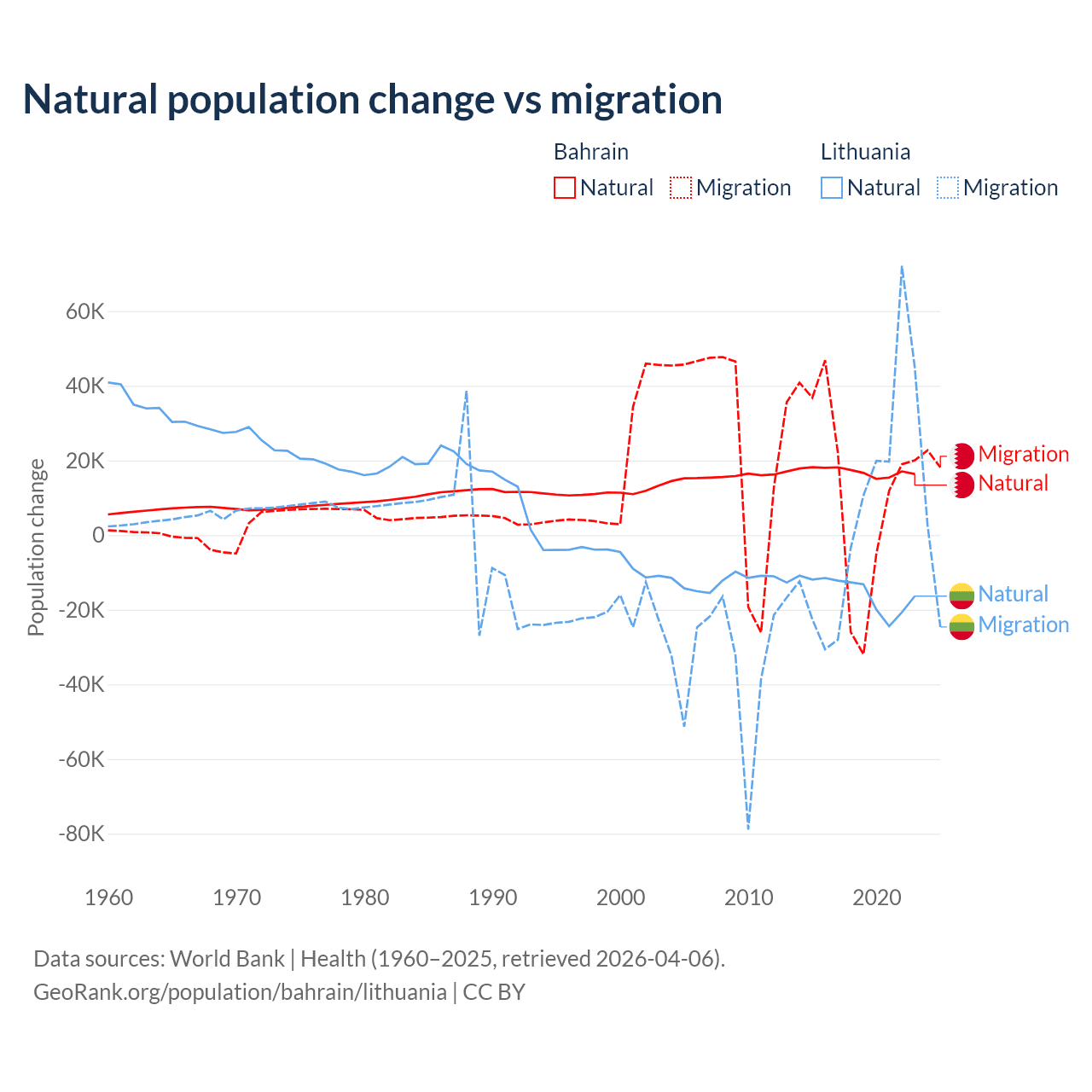 Over the last 10 years, 55.9% of the population change in Bahrain is from natural causes (a gain of 170,110 people) and 44.1% is from migration (a gain of 134,281 people). In Lithuania 68.7% is from natural causes (a loss of 153,859 people) and 31.3% is from migration (a gain of 70,196 people).