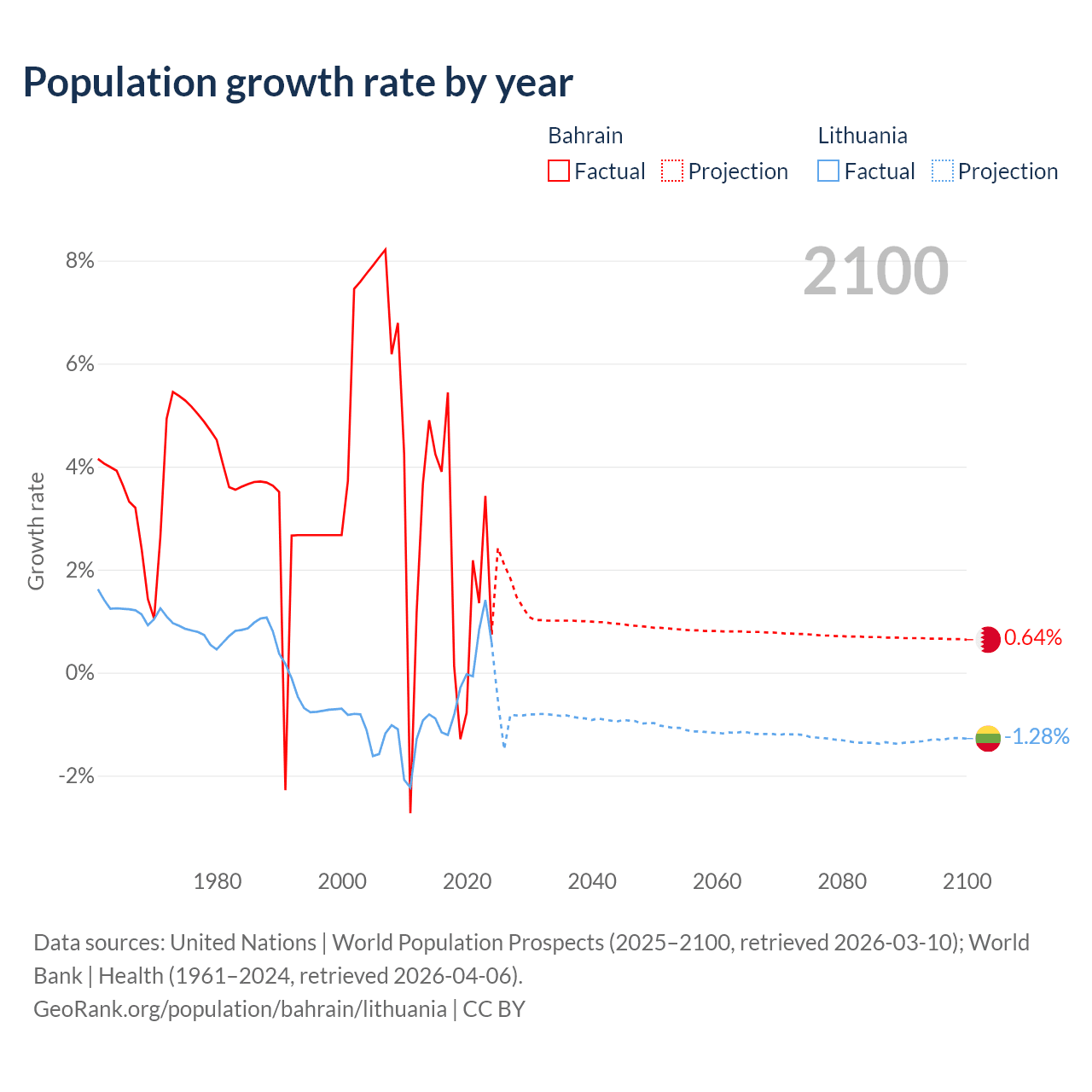 - For the last 10 years, Bahrain has had an average growth rate of +2.2% per year vs -0.22% in Lithuania.
