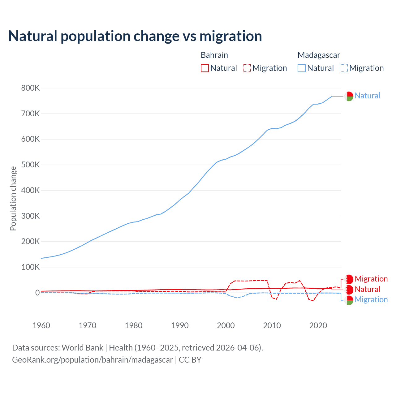Over the last 10 years, 55.9% of the population change in Bahrain is from natural causes (a gain of 170,110 people) and 44.1% is from migration (a gain of 134,281 people). In Madagascar 99.7% is from natural causes (a gain of 7,165,578 people) and 0.31% is from migration (a loss of 22,384 people).