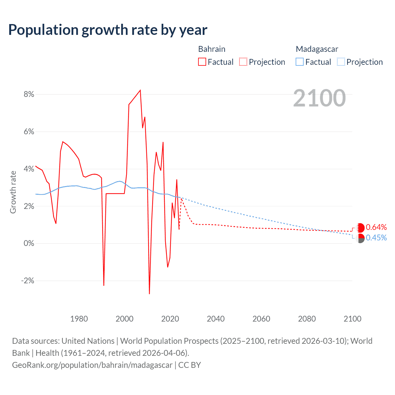 - For the last 10 years, Bahrain has had an average growth rate of +2.2% per year vs +2.6% in Madagascar.