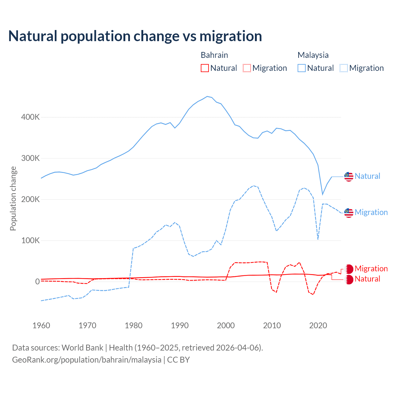 Over the last 10 years, 55.9% of the population change in Bahrain is from natural causes (a gain of 170,110 people) and 44.1% is from migration (a gain of 134,281 people). In Malaysia 61.7% is from natural causes (a gain of 3,029,648 people) and 38.3% is from migration (a gain of 1,882,159 people).