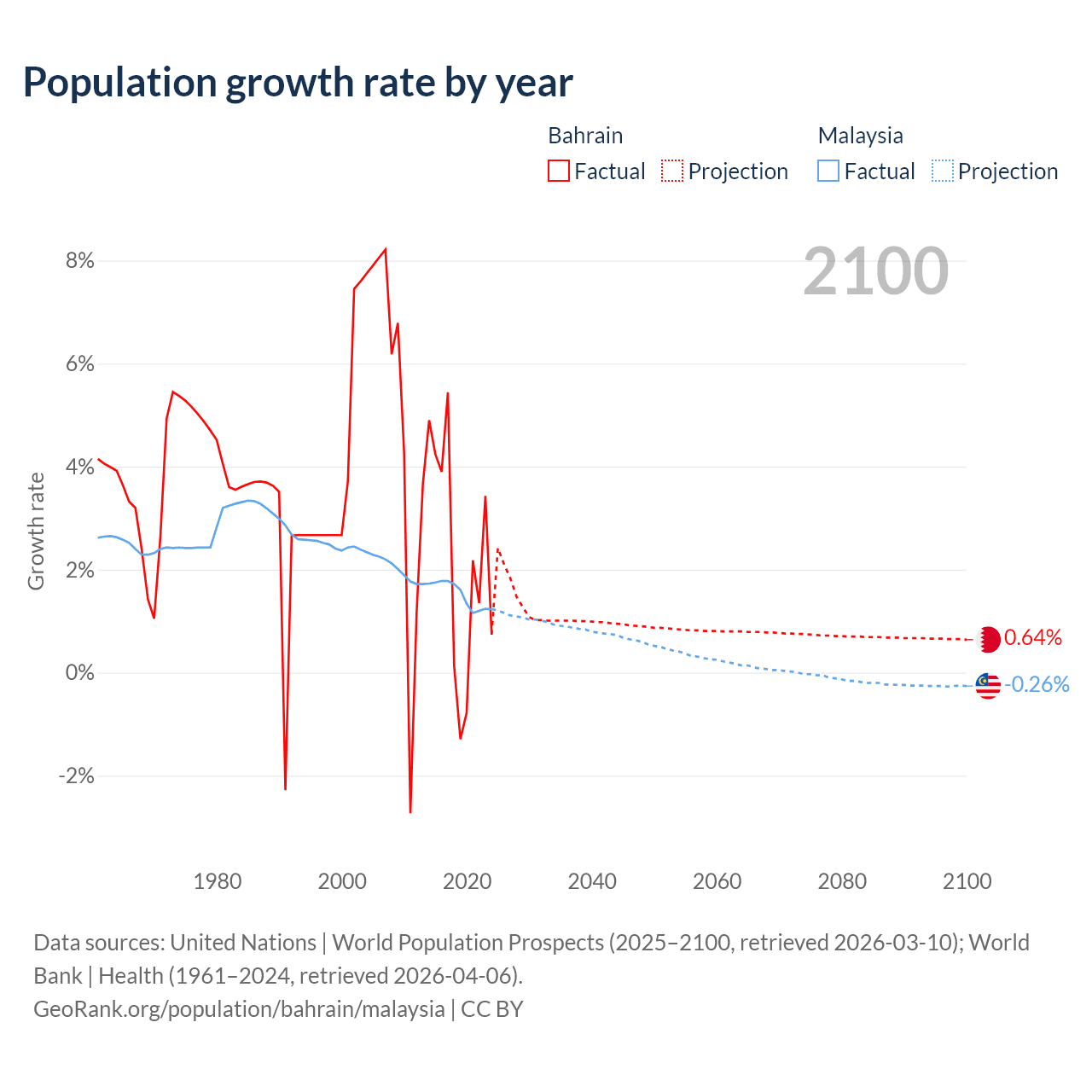 - For the last 10 years, Bahrain has had an average growth rate of +2.2% per year vs +1.5% in Malaysia.