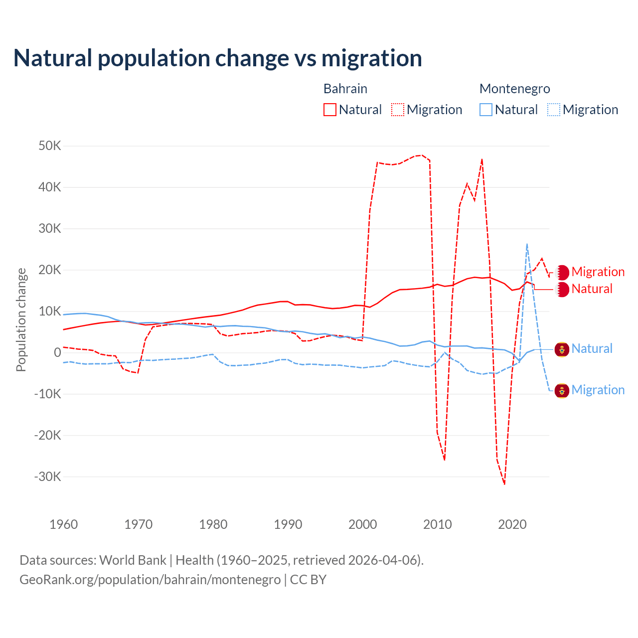Over the last 10 years, 55.9% of the population change in Bahrain is from natural causes (a gain of 170,110 people) and 44.1% is from migration (a gain of 134,281 people). In Montenegro 52.4% is from natural causes (a gain of 4,501 people) and 47.6% is from migration (a gain of 4,095 people).