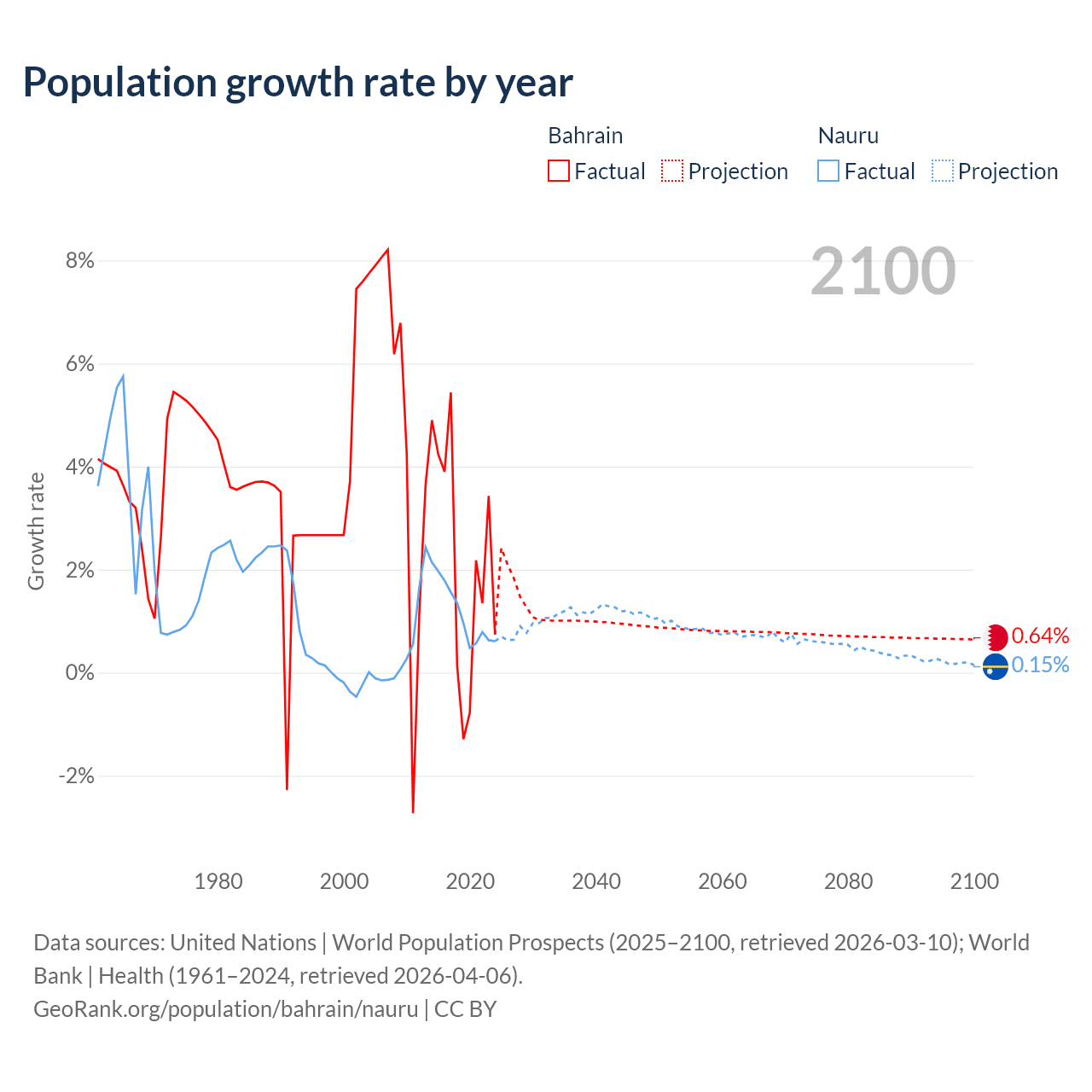 - For the last 10 years, Bahrain has had an average growth rate of +2.2% per year vs +1.17% in Nauru.