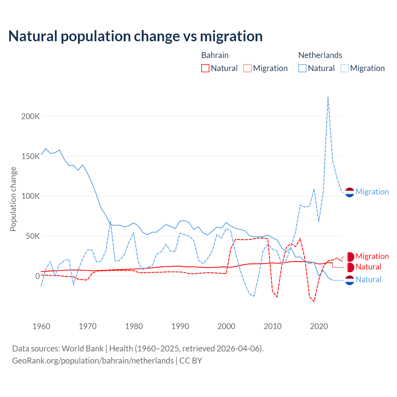 Over the last 10 years, 55.9% of the population change in Bahrain is from natural causes (a gain of 170,110 people) and 44.1% is from migration (a gain of 134,281 people). In the Netherlands 11.8% is from natural causes (a gain of 134,554 people) and 88.2% is from migration (a gain of 1,006,495 people).