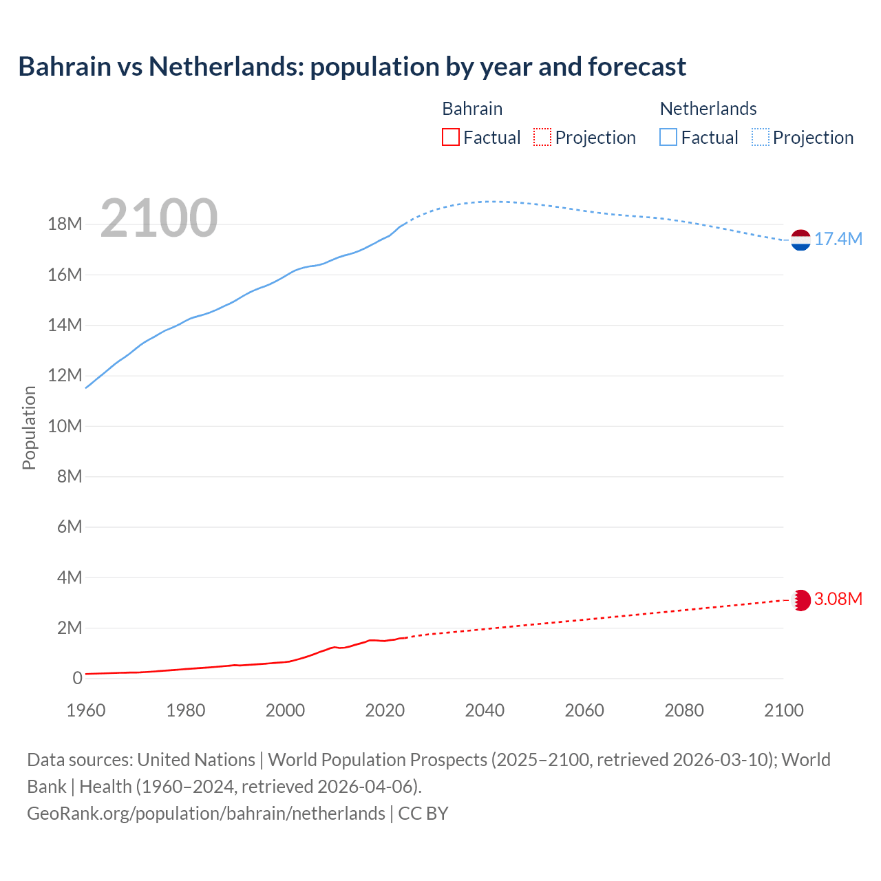 Bahrain vs Netherlands: population by year and forecast