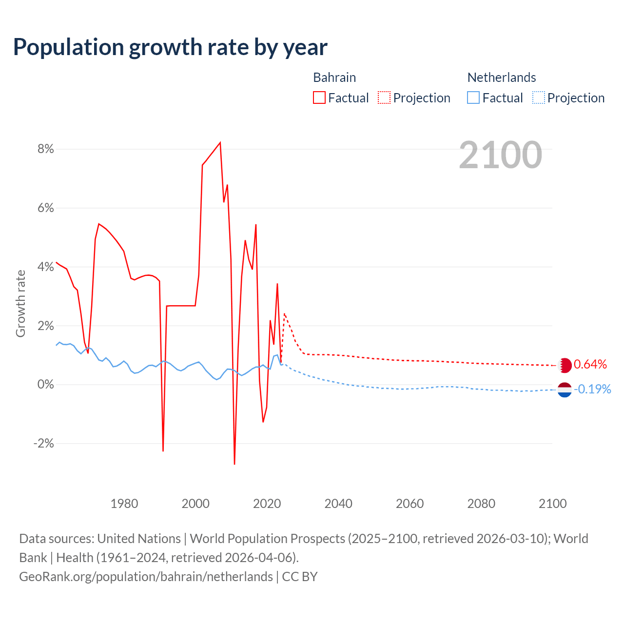 - For the last 10 years, Bahrain has had an average growth rate of +2.2% per year vs +0.62% in the Netherlands.
