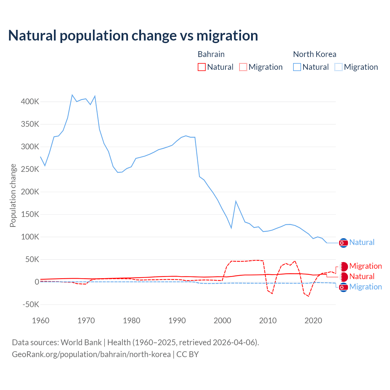 Over the last 10 years, 55.9% of the population change in Bahrain is from natural causes (a gain of 170,110 people) and 44.1% is from migration (a gain of 134,281 people). In North Korea 97.7% is from natural causes (a gain of 1,097,372 people) and 2.33% is from migration (a loss of 26,227 people).