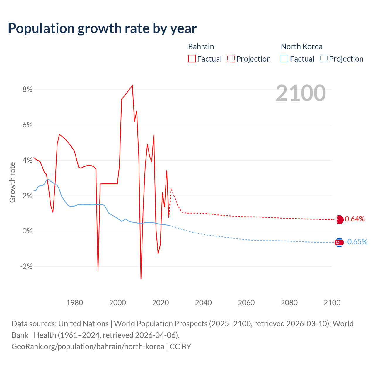 - For the last 10 years, Bahrain has had an average growth rate of +2.2% per year vs +0.41% in North Korea.