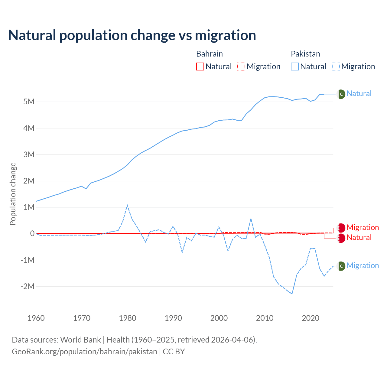 Over the last 10 years, 55.9% of the population change in Bahrain is from natural causes (a gain of 170,110 people) and 44.1% is from migration (a gain of 134,281 people). In Pakistan 77.8% is from natural causes (a gain of 51,255,404 people) and 22.2% is from migration (a loss of 14,629,055 people).