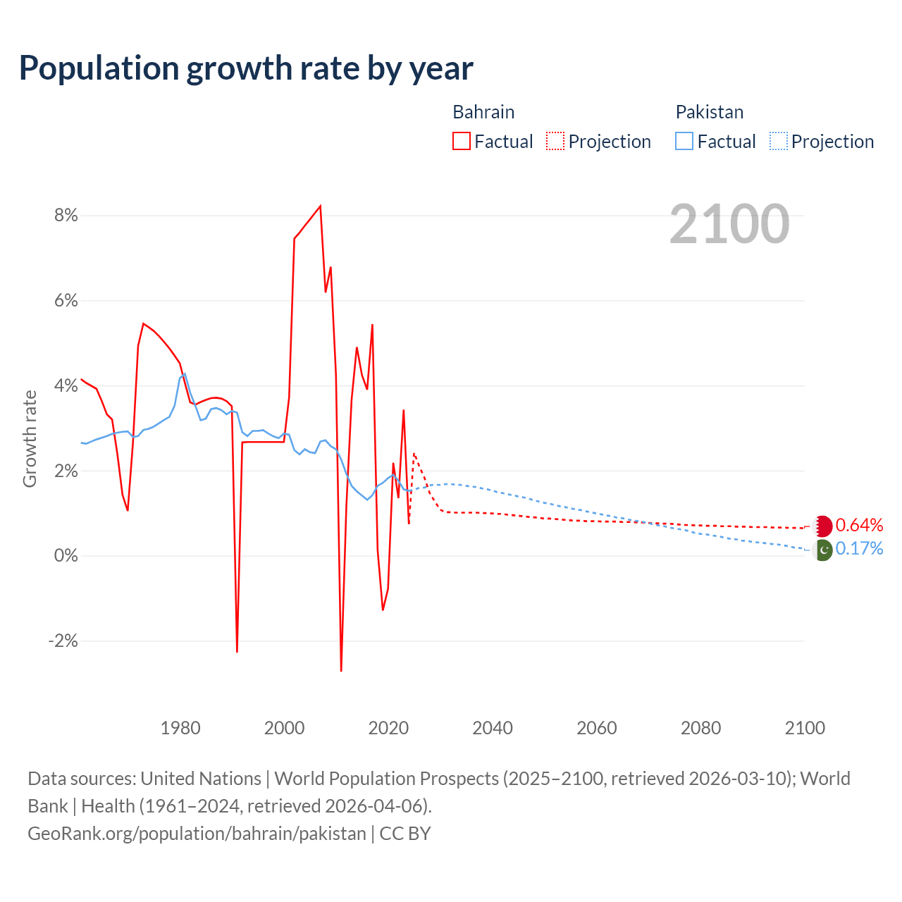 - For the last 10 years, Bahrain has had an average growth rate of +2.2% per year vs +1.6% in Pakistan.