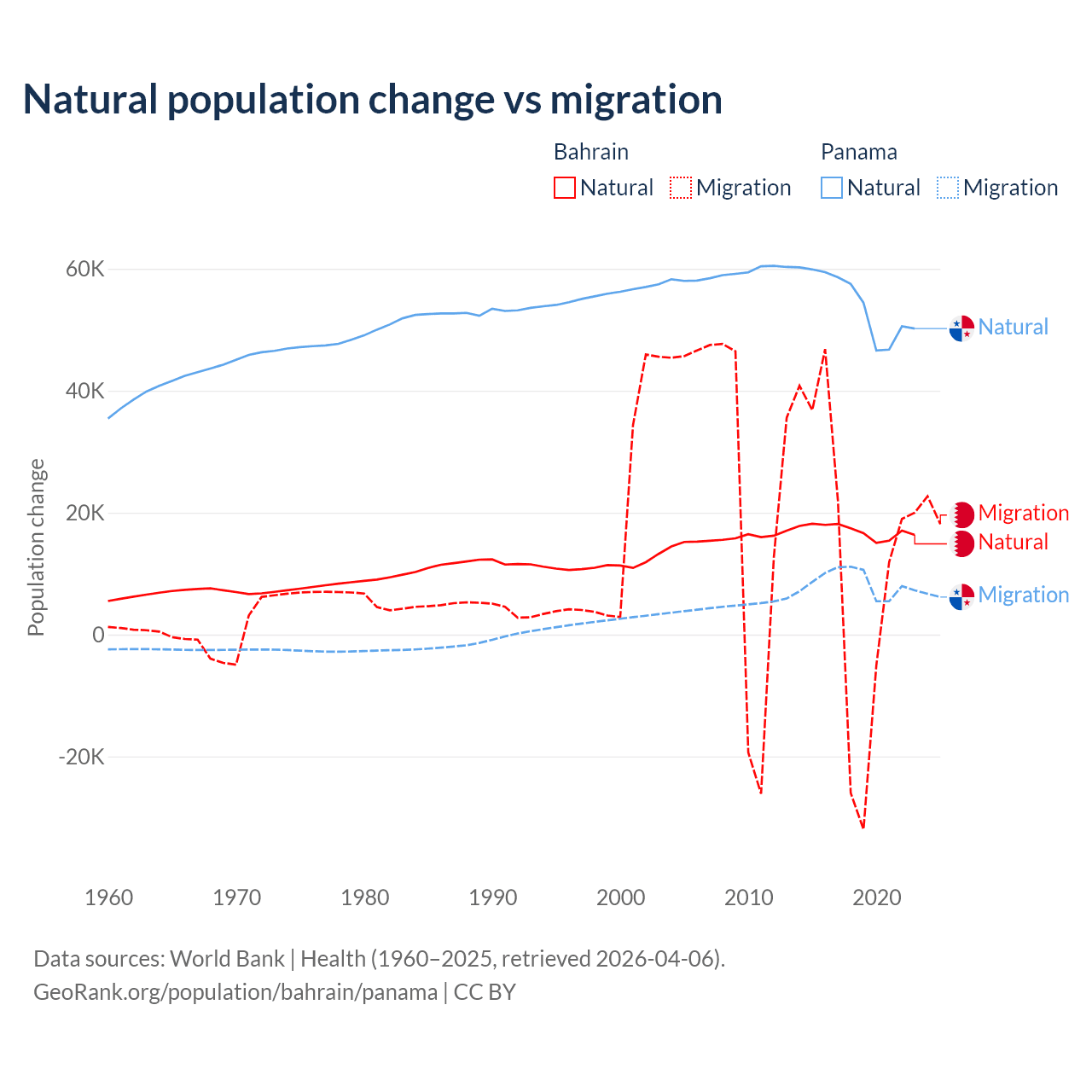 Over the last 10 years, 55.9% of the population change in Bahrain is from natural causes (a gain of 170,110 people) and 44.1% is from migration (a gain of 134,281 people). In Panama 86.5% is from natural causes (a gain of 544,211 people) and 13.5% is from migration (a gain of 84,849 people).