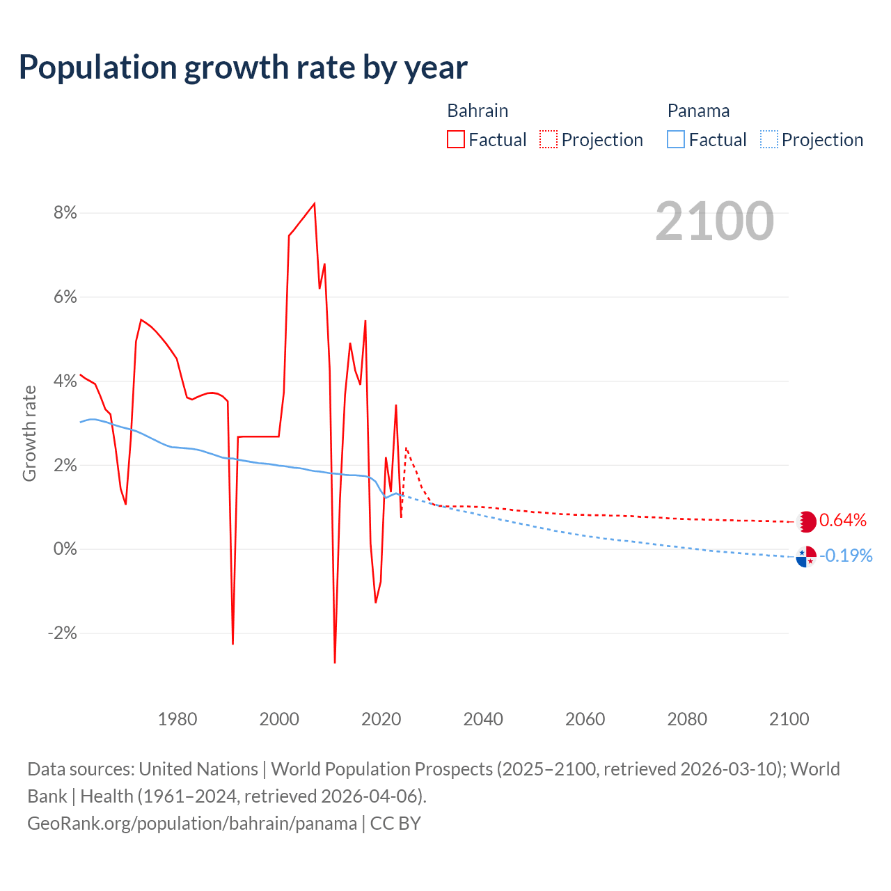 - For the last 10 years, Bahrain has had an average growth rate of +2.2% per year vs +1.52% in Panama.