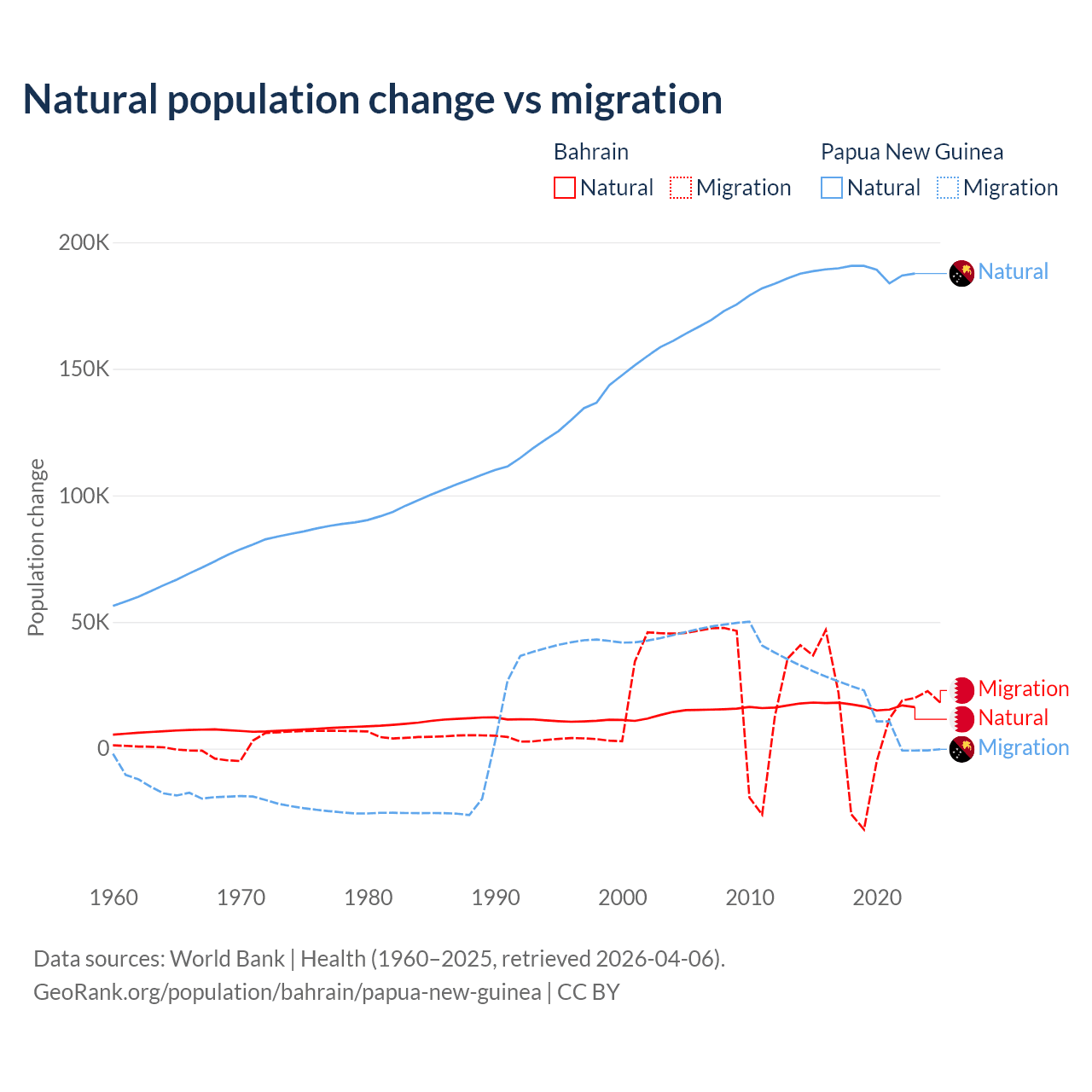 Over the last 10 years, 55.9% of the population change in Bahrain is from natural causes (a gain of 170,110 people) and 44.1% is from migration (a gain of 134,281 people). In Papua New Guinea 91% is from natural causes (a gain of 1,883,906 people) and 8.98% is from migration (a gain of 185,900 people).