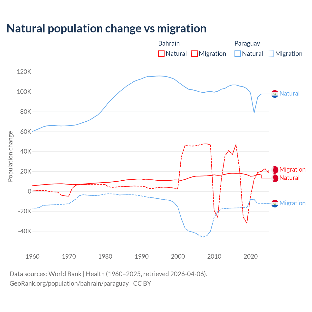 Over the last 10 years, 55.9% of the population change in Bahrain is from natural causes (a gain of 170,110 people) and 44.1% is from migration (a gain of 134,281 people). In Paraguay 87.6% is from natural causes (a gain of 1,002,636 people) and 12.4% is from migration (a loss of 141,377 people).