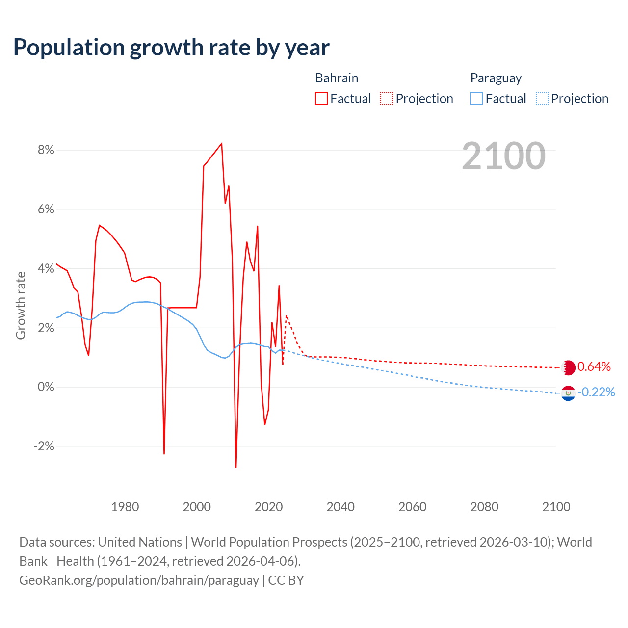 - For the last 10 years, Bahrain has had an average growth rate of +2.2% per year vs +1.34% in Paraguay.