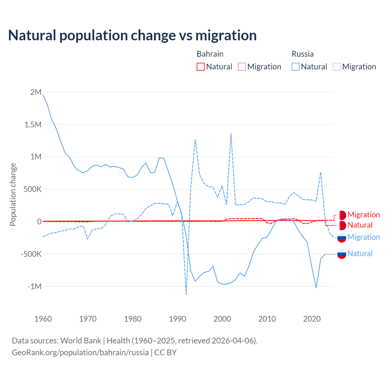 Over the last 10 years, 55.9% of the population change in Bahrain is from natural causes (a gain of 170,110 people) and 44.1% is from migration (a gain of 134,281 people). In Russia 48.6% is from natural causes (a loss of 3,416,377 people) and 51.4% is from migration (a gain of 3,611,826 people).