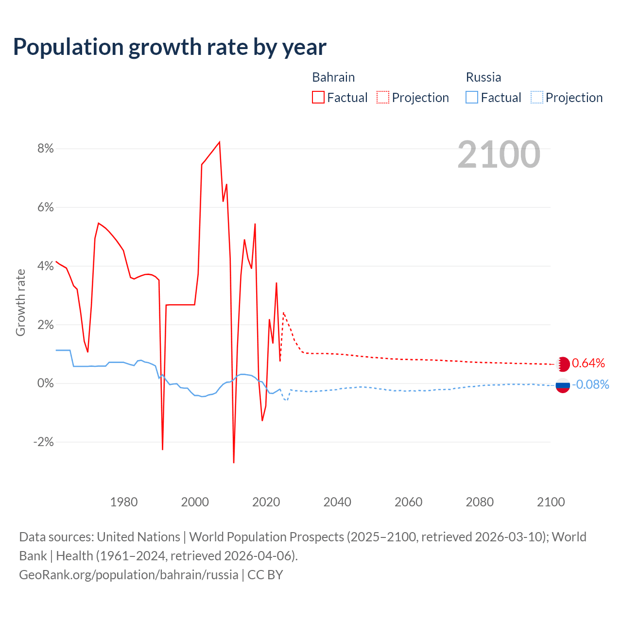- Since 2006, the population of Bahrain has increased from 960K people to 1.67M (73.8% growth), while Russia has declined from 143M to 142M (0.8% decline).