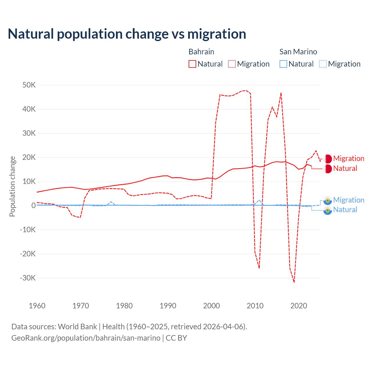 Over the last 10 years, 55.9% of the population change in Bahrain is from natural causes (a gain of 170,110 people) and 44.1% is from migration (a gain of 134,281 people). In San Marino 40.9% is from natural causes (a loss of 358 people) and 59.1% is from migration (a gain of 517 people).