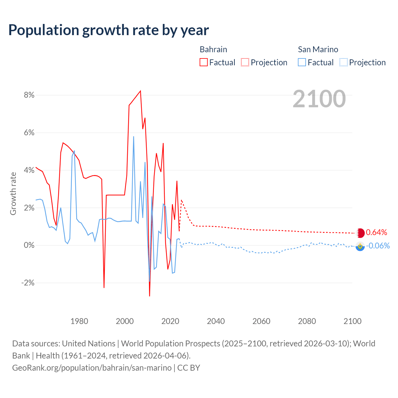 - For the last 10 years, Bahrain has had an average growth rate of +2.2% per year vs +0.26% in San Marino.