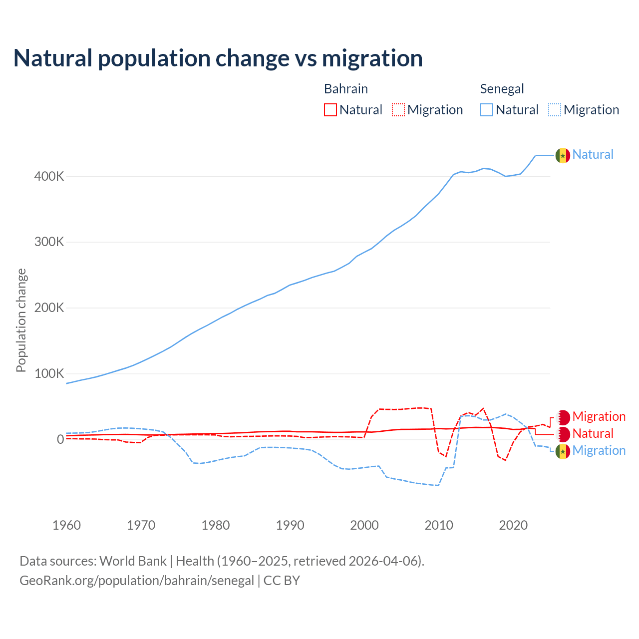Over the last 10 years, 55.9% of the population change in Bahrain is from natural causes (a gain of 170,110 people) and 44.1% is from migration (a gain of 134,281 people). In Senegal 93.9% is from natural causes (a gain of 4,089,205 people) and 6.13% is from migration (a gain of 267,266 people).