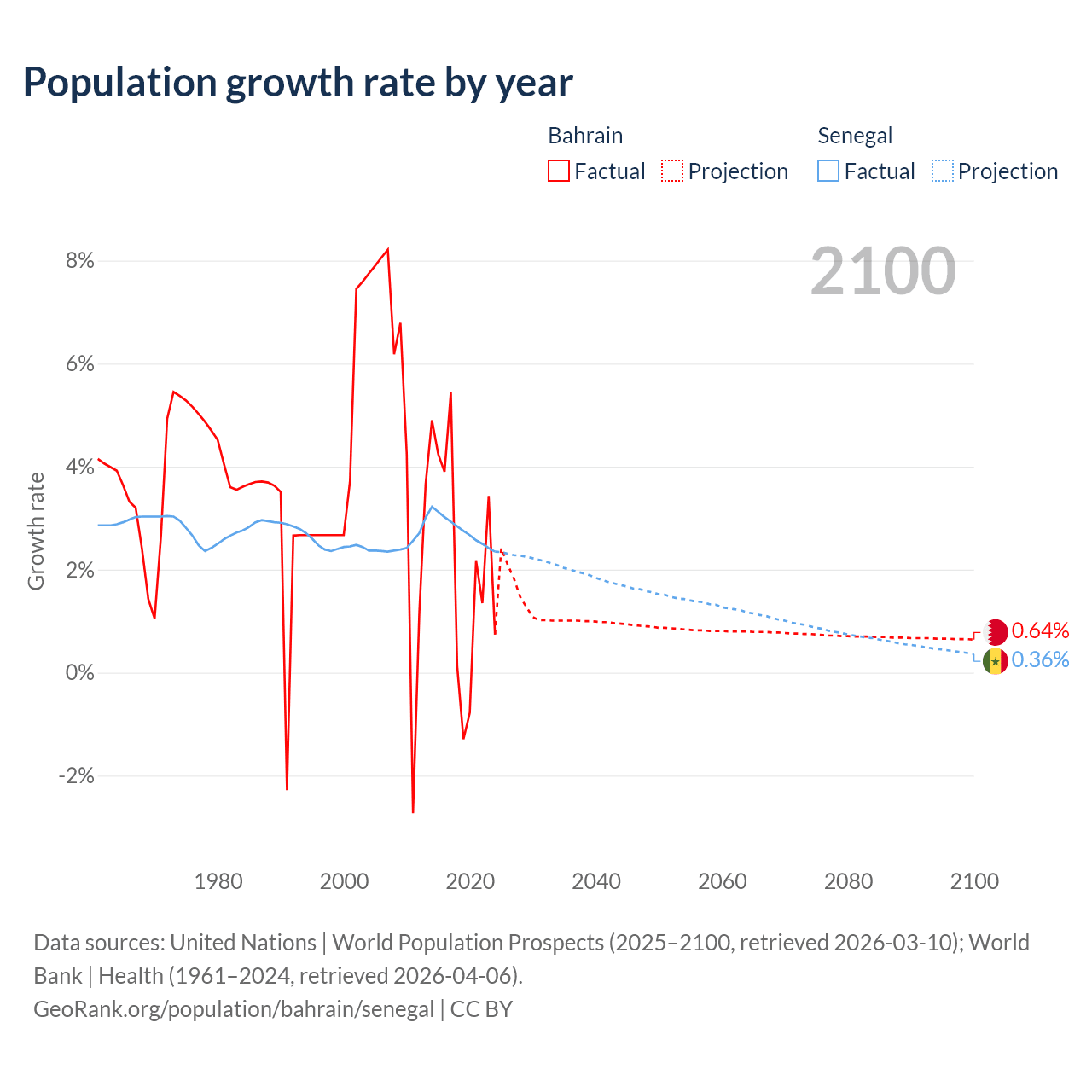- Since 2006, the population of Bahrain has increased from 960K people to 1.67M (73.8% growth), while Senegal has grown from 11.5M to 19.5M (69.5% growth).