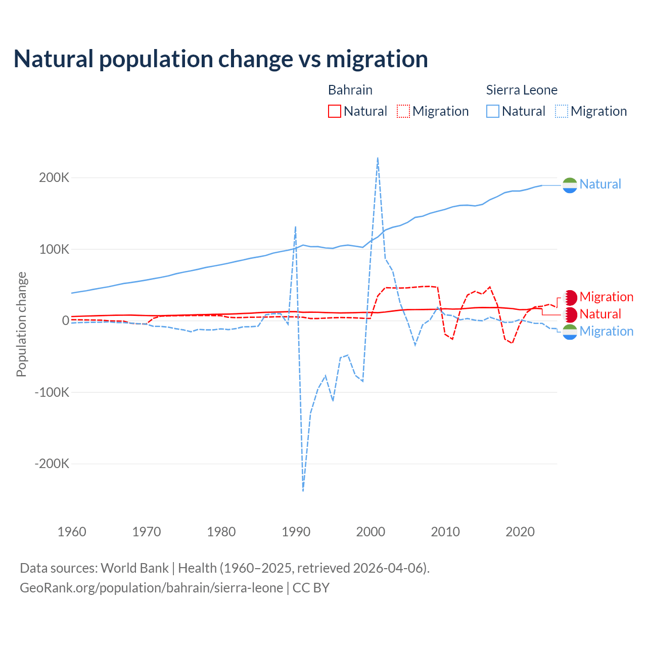 Over the last 10 years, 55.9% of the population change in Bahrain is from natural causes (a gain of 170,110 people) and 44.1% is from migration (a gain of 134,281 people). In Sierra Leone 99.6% is from natural causes (a gain of 1,764,049 people) and 0.41% is from migration (a loss of 7,211 people).