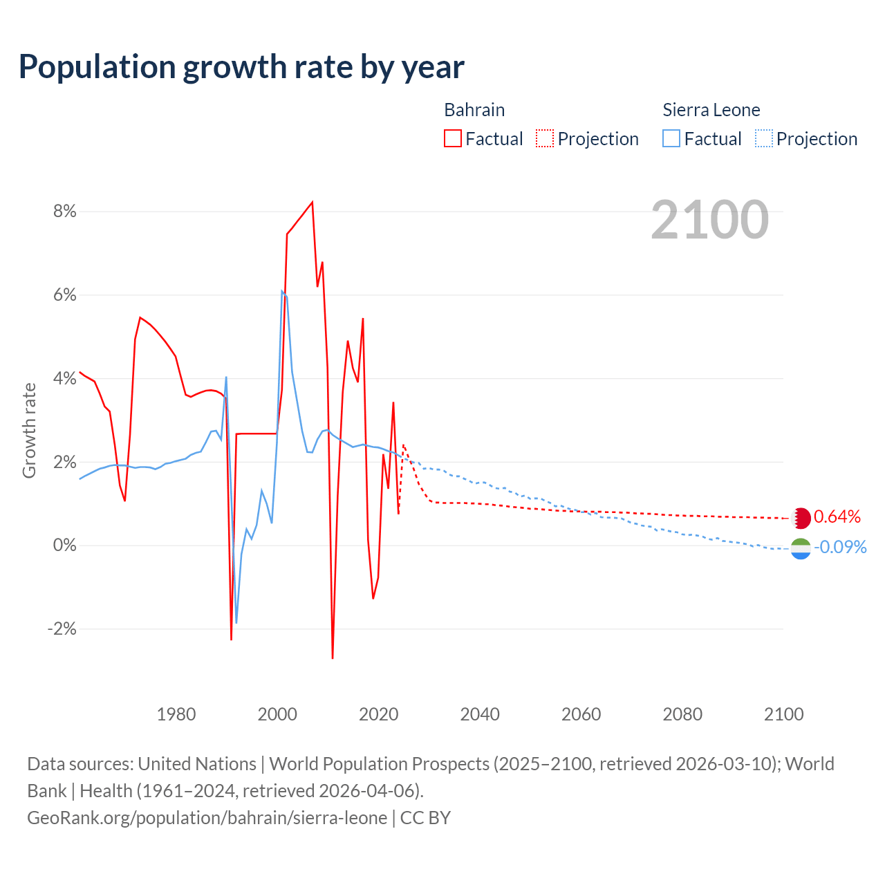 - For the last 10 years, Bahrain has had an average growth rate of +2.2% per year vs +2.32% in Sierra Leone.