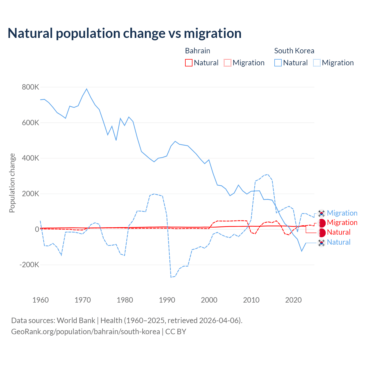 Over the last 10 years, 55.9% of the population change in Bahrain is from natural causes (a gain of 170,110 people) and 44.1% is from migration (a gain of 134,281 people). In South Korea 17.6% is from natural causes (a gain of 277,215 people) and 82.4% is from migration (a gain of 1,298,356 people).