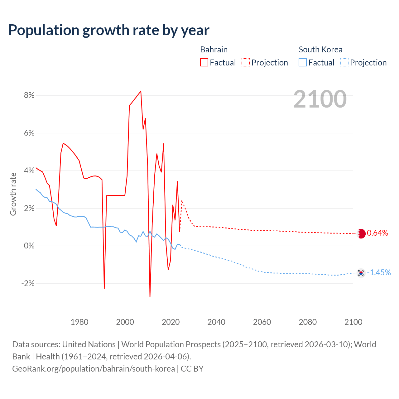 - For the last 10 years, Bahrain has had an average growth rate of +2.2% per year vs +0.24% in South Korea.
