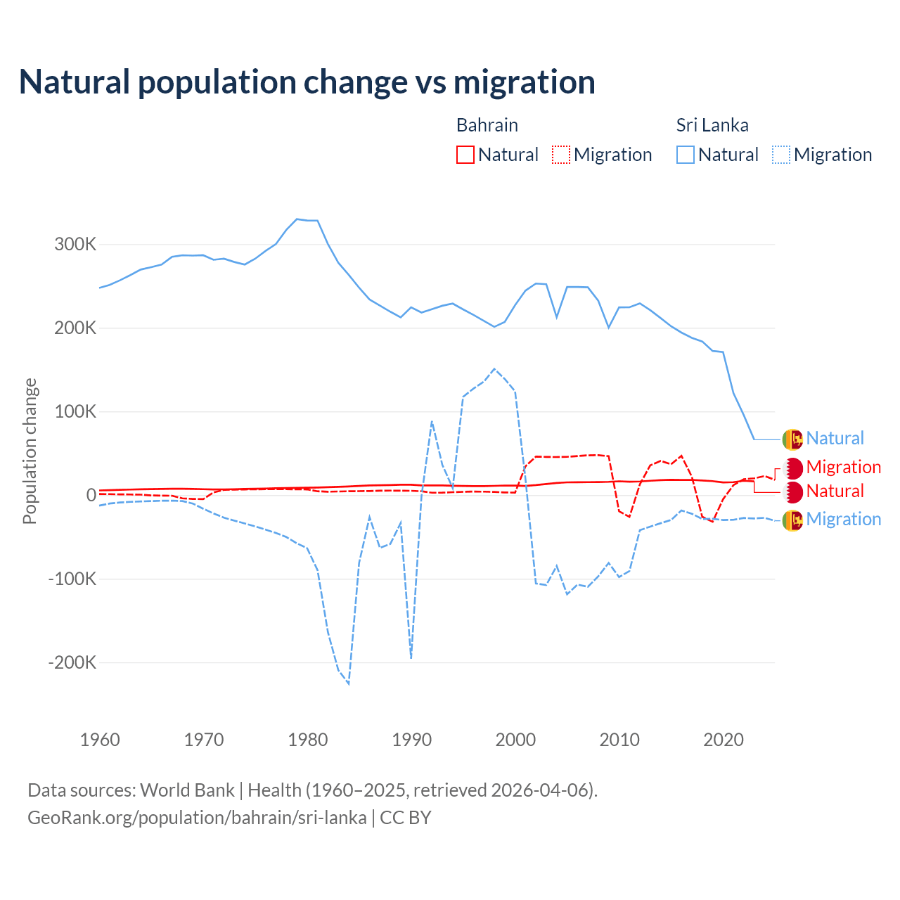 Over the last 10 years, 55.9% of the population change in Bahrain is from natural causes (a gain of 170,110 people) and 44.1% is from migration (a gain of 134,281 people). In Sri Lanka 85.3% is from natural causes (a gain of 1,605,749 people) and 14.7% is from migration (a loss of 276,121 people).