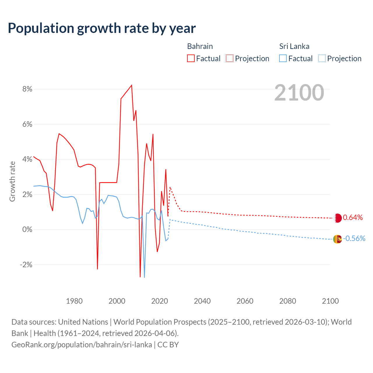 - For the last 10 years, Bahrain has had an average growth rate of +2.2% per year vs +0.57% in Sri Lanka.