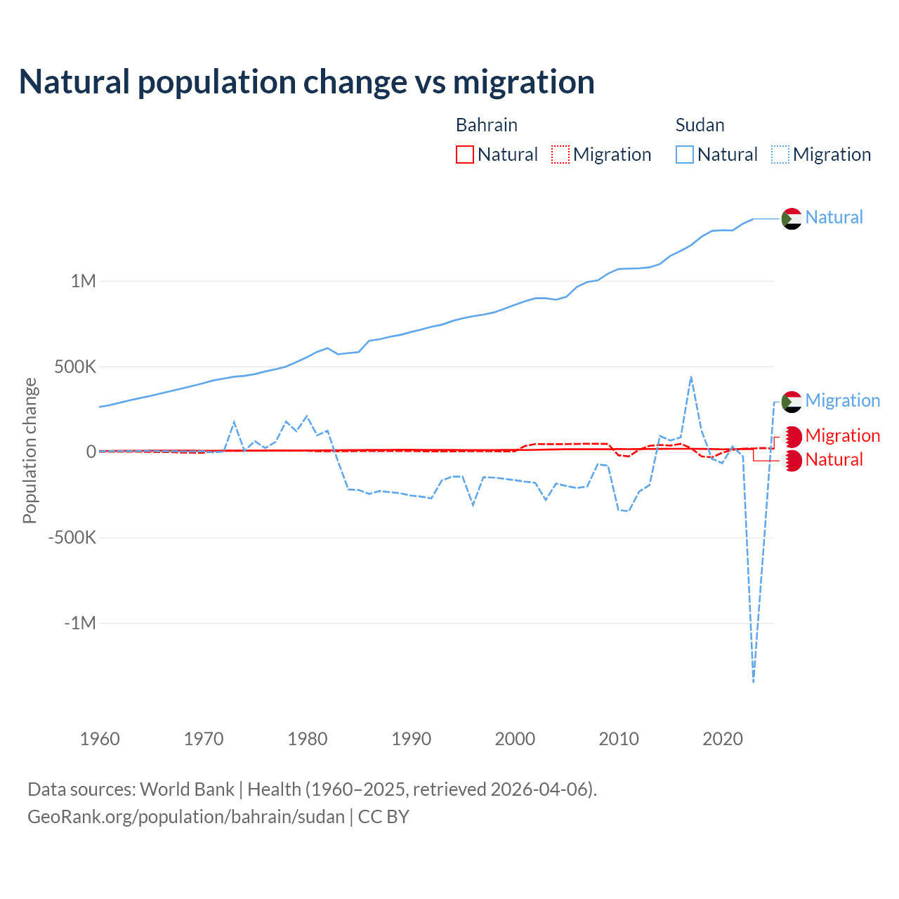 Over the last 10 years, 55.9% of the population change in Bahrain is from natural causes (a gain of 170,110 people) and 44.1% is from migration (a gain of 134,281 people). In Sudan 95.1% is from natural causes (a gain of 12,459,977 people) and 4.88% is from migration (a loss of 639,596 people).