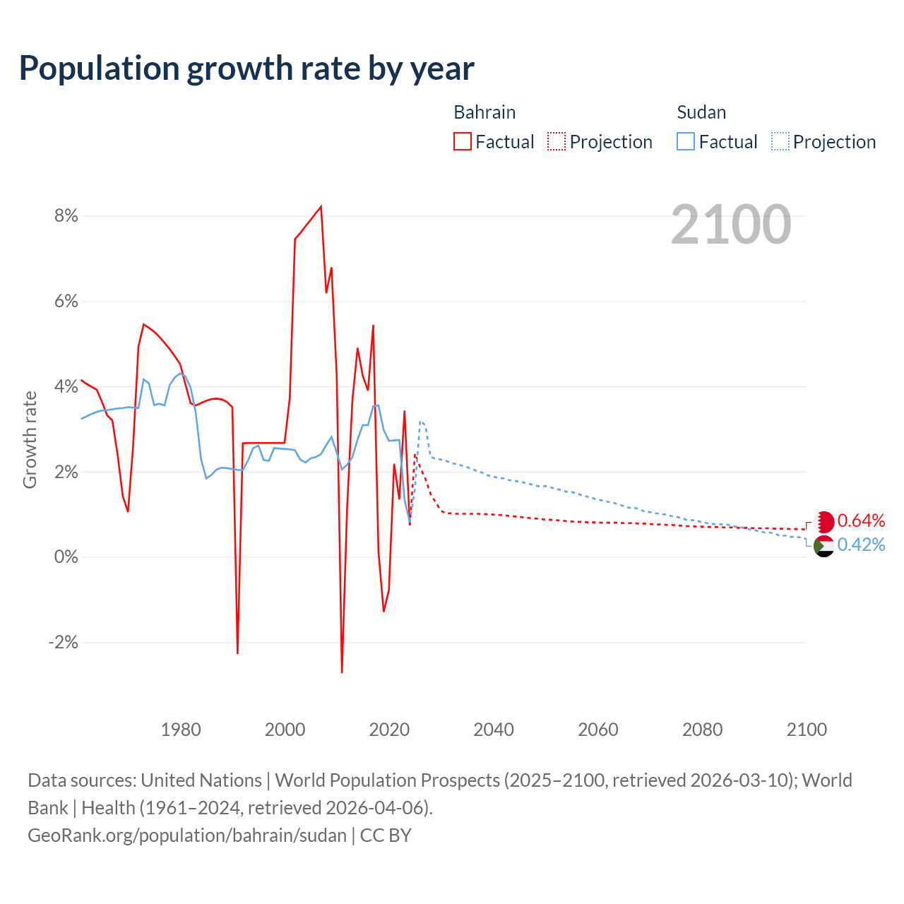 - For the last 10 years, Bahrain has had an average growth rate of +2.2% per year vs +2.67% in Sudan.
