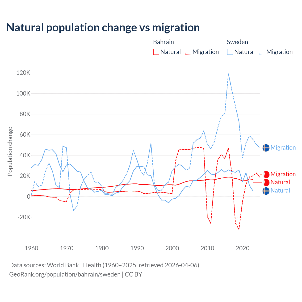 Over the last 10 years, 55.9% of the population change in Bahrain is from natural causes (a gain of 170,110 people) and 44.1% is from migration (a gain of 134,281 people). In Sweden 21.4% is from natural causes (a gain of 201,900 people) and 78.6% is from migration (a gain of 743,642 people).