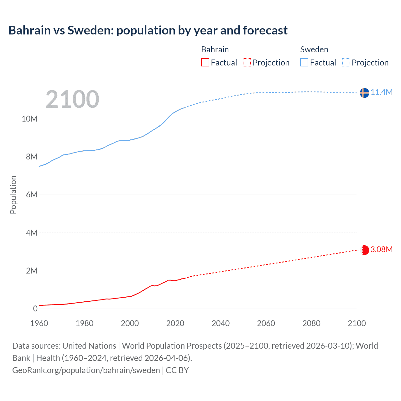 The latest officially reported population of Bahrain was 1,588,670 in 2024 vs 10,569,709 people in Sweden in 2024. In 2026, based on the adjusted UN estimation, the current Bahrain's population is 1,669,503 people compared to 10,680,056 in Sweden.