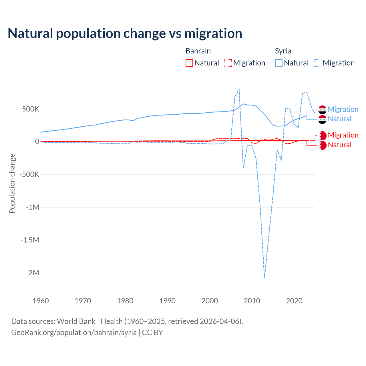 Over the last 10 years, 55.9% of the population change in Bahrain is from natural causes (a gain of 170,110 people) and 44.1% is from migration (a gain of 134,281 people). In Syria 91.3% is from natural causes (a gain of 3,047,621 people) and 8.72% is from migration (a gain of 291,069 people).