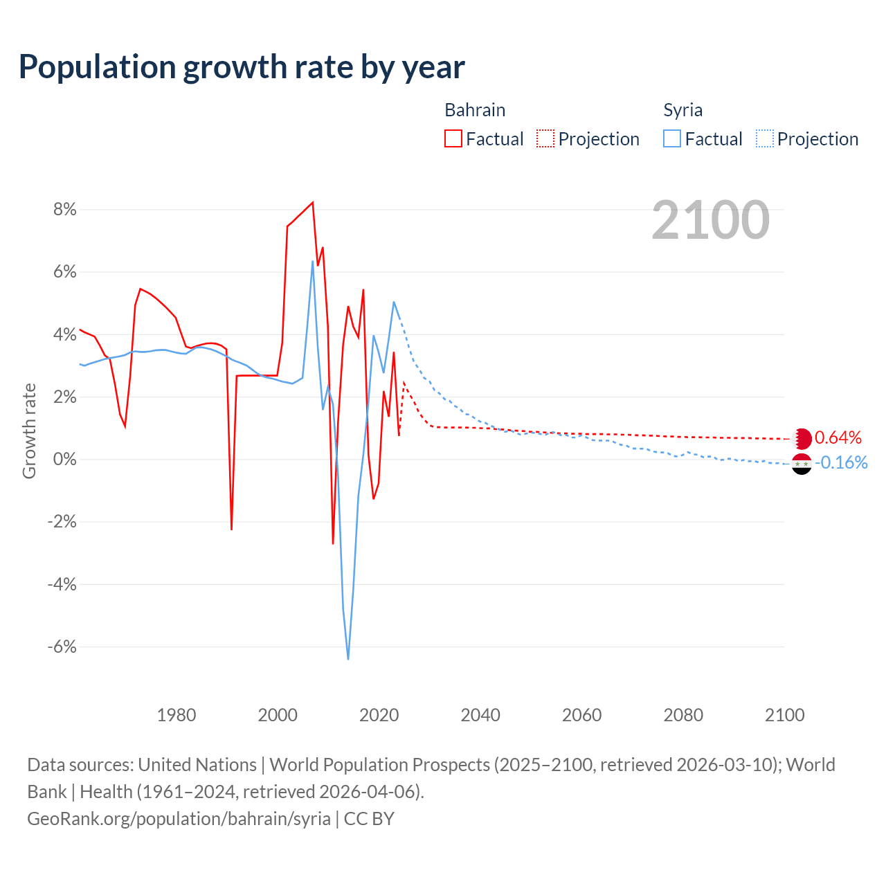 - For the last 10 years, Bahrain has had an average growth rate of +2.2% per year vs +1.25% in Syria.