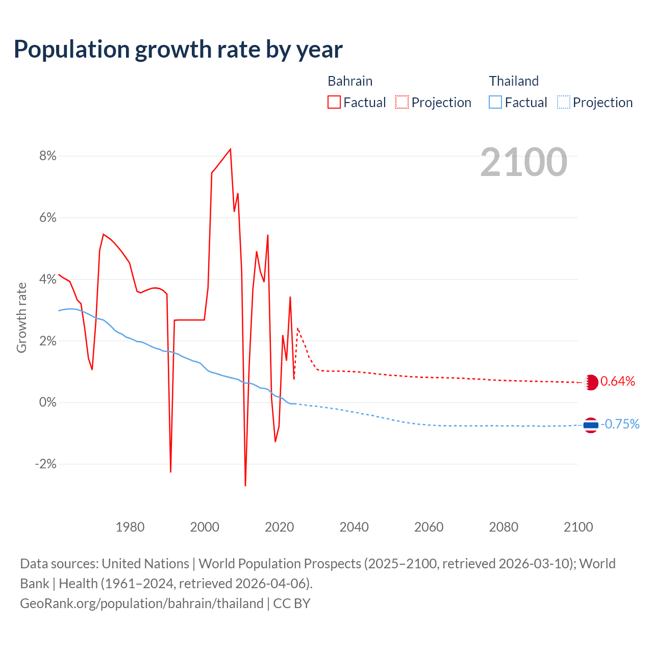 - For the last 10 years, Bahrain has had an average growth rate of +2.2% per year vs +0.23% in Thailand.