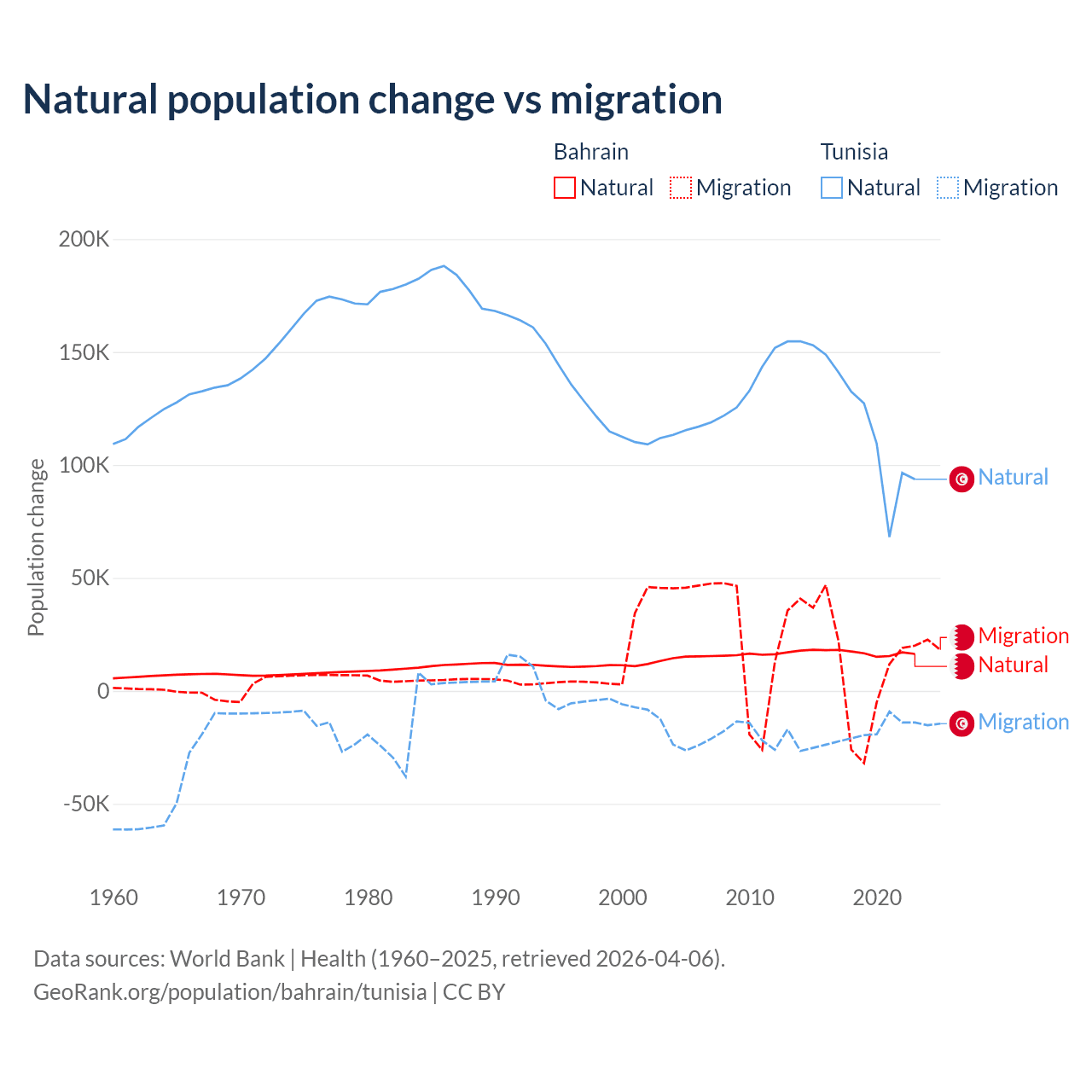 Over the last 10 years, 55.9% of the population change in Bahrain is from natural causes (a gain of 170,110 people) and 44.1% is from migration (a gain of 134,281 people). In Tunisia 86.3% is from natural causes (a gain of 1,225,079 people) and 13.7% is from migration (a loss of 195,011 people).