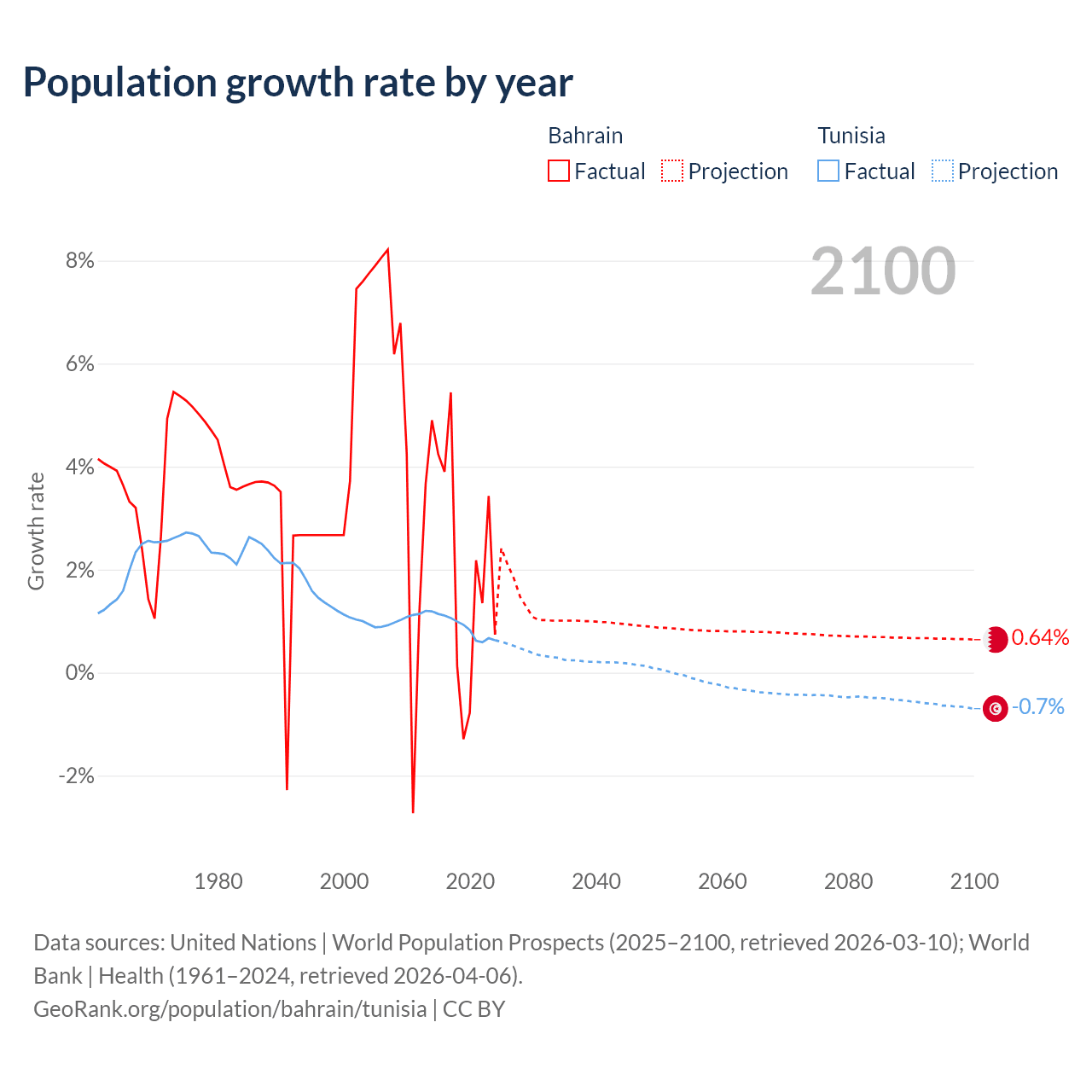 - For the last 10 years, Bahrain has had an average growth rate of +2.2% per year vs +0.89% in Tunisia.