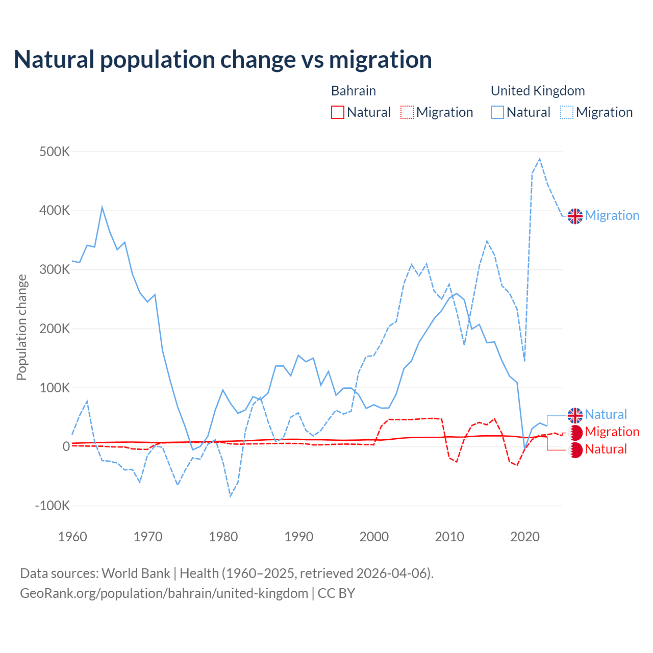 Over the last 10 years, 55.9% of the population change in Bahrain is from natural causes (a gain of 170,110 people) and 44.1% is from migration (a gain of 134,281 people). In the United Kingdom 23.9% is from natural causes (a gain of 1,033,129 people) and 76.1% is from migration (a gain of 3,283,101 people).