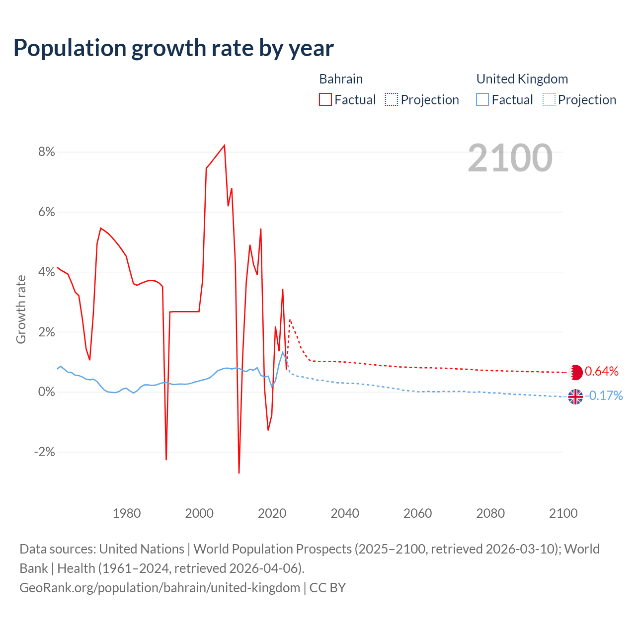 - Since 2006, the population of Bahrain has increased from 960K people to 1.67M (73.8% growth), while the United Kingdom has grown from 60.8M to 70.2M (15.3% growth).