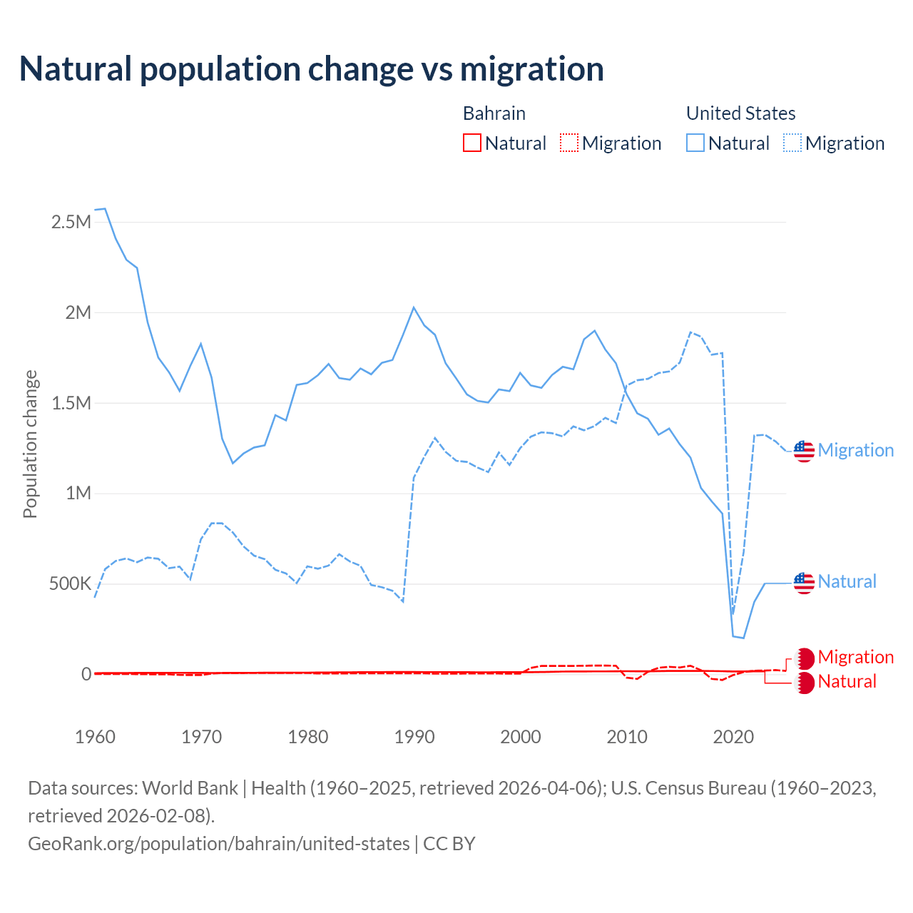 Data sources: World Bank | Health (1960–2025, retrieved 2026-04-06); U.S. Census Bureau (1960–2023, retrieved 2026-02-08).